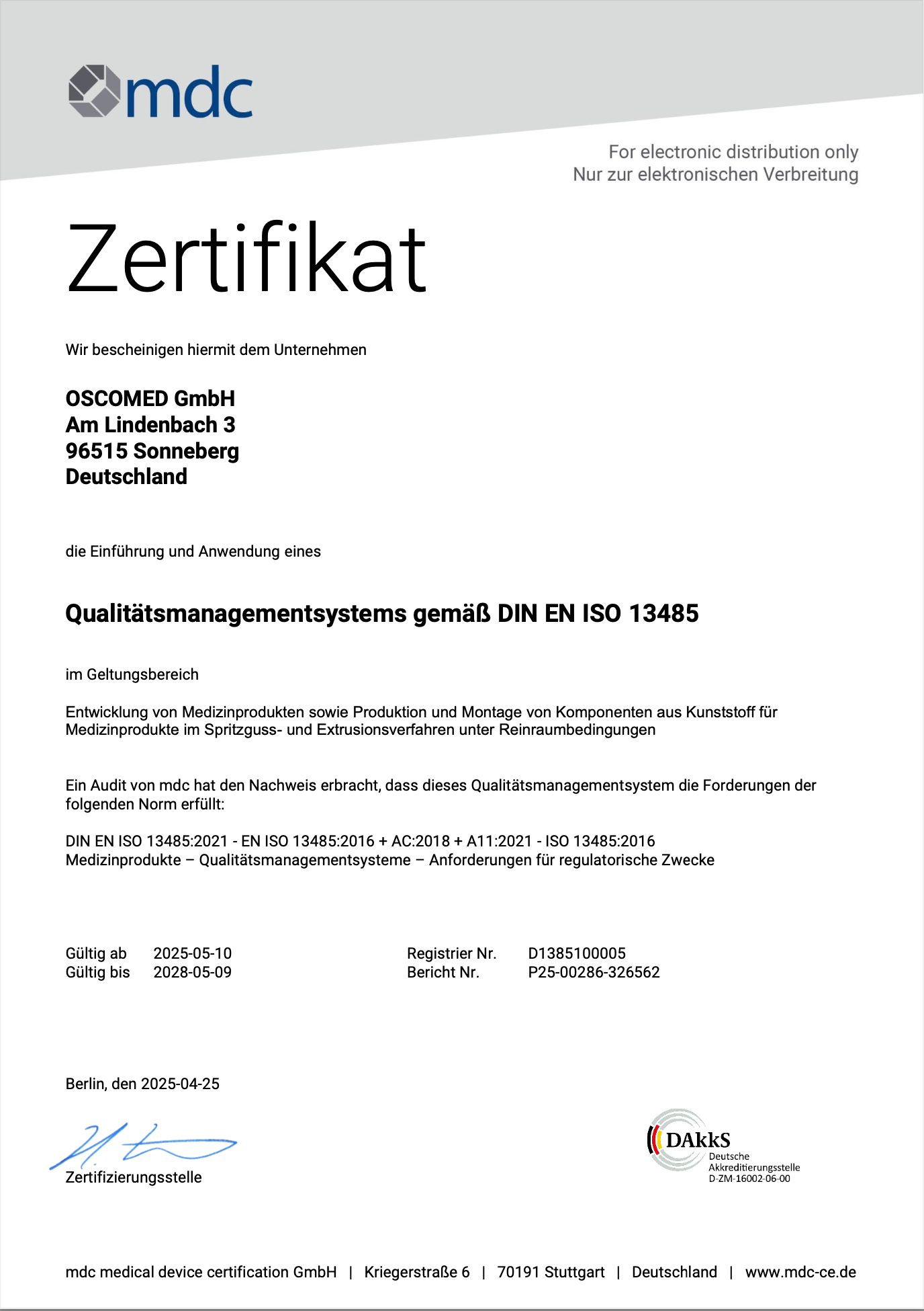 Alle Standorte von OSCOMED sind nach ISO 13485:2016 zertifiziert. Unsere Prozesse orientieren sich zusätzlich an den Anforderungen der GMP-Richtlinien (21 CFR 820, FDA). Für unsere Kunden bedeutet das: sichere Dokumentation, auditfähige Prozesse und maximale Produktqualität.